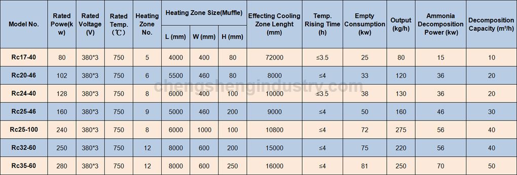 This device is mainly composed of transmission system, heating system, cooling system, control system, and ammonia decomposition gas supply system. The muffle furnace is made of imported high-temperature resistance nickel alloy by pressing welding; dismountable electric heating elements can upper-lower heat; steel belt conveying is stepless speed regulating; the gas mixture (hydrogen 75% and oxygen 25%) decomposed from liquid ammonia gets into the hearth and reaches gas protection effect; the gas direction regulating device ensure stable atmosphere. Having treated by this kind of furnace, product surface will become bright and won’t be oxidized. All treated products will reach excellent consistency.